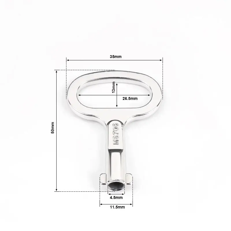 Nikellə örtülmüş alüminium ikiqat bit düyməsi: ümumi ölçülər 35 × 50mm, kilidli silindr mərkəzi diametrli 4.5mm, kilid silindr mərkəzi + ikiqat diş diametri 11.5mm.