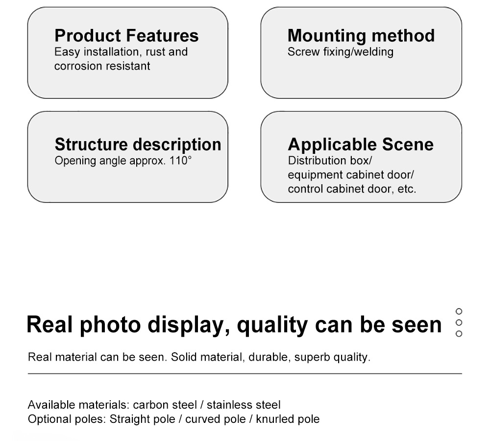 Yitai Lock sənaye şkaf layihələri üçün stokda Distribution Board Swivel Hinge-ə malikdir. 110°-ə qədər açılma bucağı ilə CL248 Paylama Panelinin Fırlanan Menteşəsi naqillərin çəkilməsi, yoxlama və texniki qulluq üçün geniş yer təmin edir. Şkafın quruluşuna əsasən vintlər və ya qaynaq ilə sabitlənə bilər. İsteğe bağlı düz çubuq, əyilmiş çubuq və ya dırnaqlı çubuq ilə Paylayıcı Panelin Dönən Menteşəsi müxtəlif qapı çərçivələrinin tərtibatlarına və montaj üsullarına uyğunlaşır.
